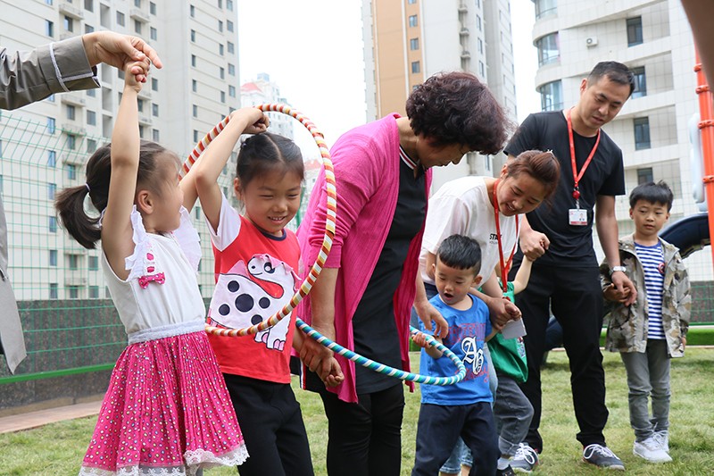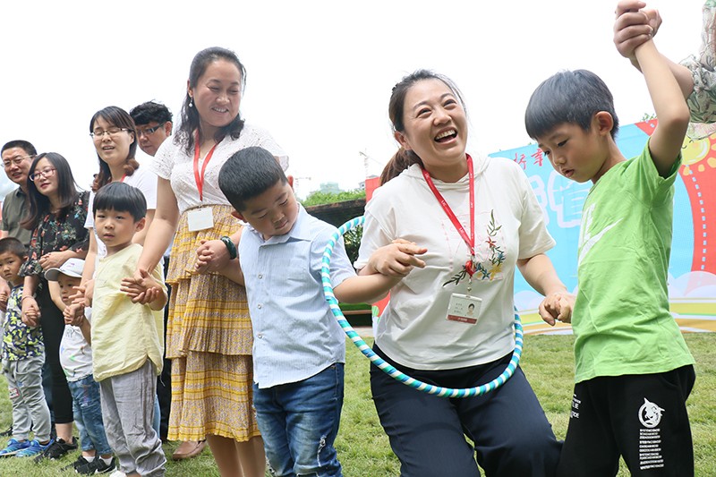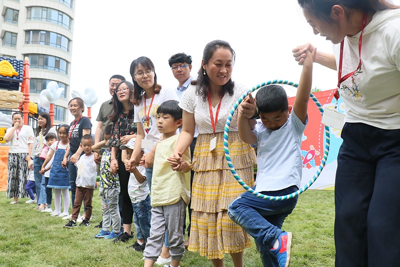 員工和孩子們手牽手站成兩列,分別傳遞呼啦圈。爸媽耐心為孩子們講解規則,孩子們幫著爸媽提高傳遞速度。這傳遞的不是呼啦圈,而是快樂和溫暖呀。