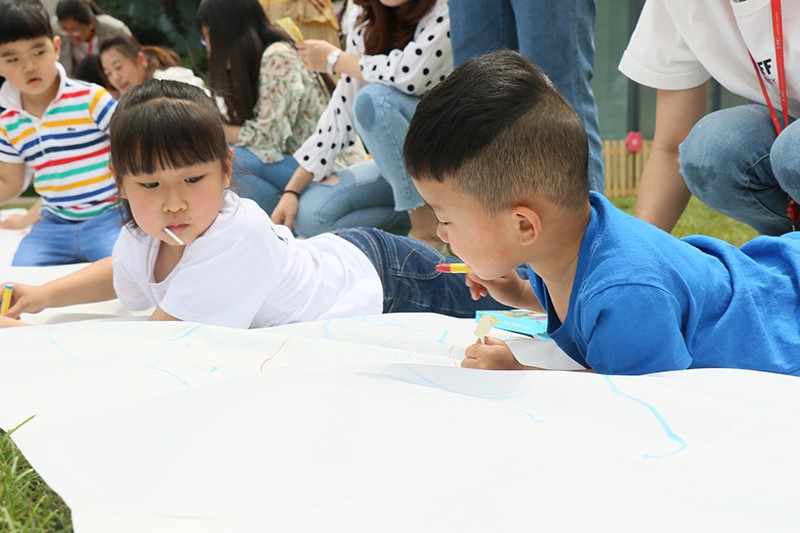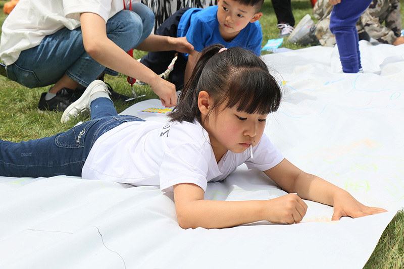 考驗美術天賦的時候到啦!孩子們躺在畫布上,爸媽拿起畫筆,認真描繪著孩子的模樣。你看,五顏六色的畫筆,畫出了一個多姿多彩的童年。