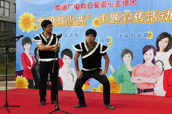 2015年10月16日,威海廣電攜手聯(lián)橋集團(tuán)在集團(tuán)海天一品社區(qū)噴泉廣場舉行“文明我當(dāng)先”主題宣傳活動。威海電視臺愛心主播白雪、張帆、齊賽、劉偉豪等親臨現(xiàn)場,通過節(jié)目表演、知識講解,做游戲等形式,與大家互動交流,在輕松愉快中傳播“愛文明家園做文明市民”的理念。